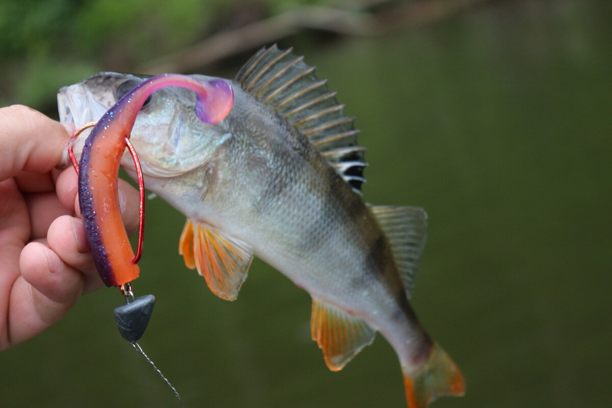 Кроме охоты классическим джигом, удалось, как я и упомянул выше, половить и в варианте без огрузки. Благо, масса приманки к этому располагает. Ловить приходилось не потому, что ковер растительности застилал поверхность воды, а из-за небольшого пространства свободной воды и, несмотря на начало лета, вялой реакции окуня на воблеры минноу и классический джиг. Кроме полосатого, в прилове нередко попадались травянки, которые, к моему великому сожалению, часто резали флюр, и, после потери нескольких монтажей, я принял решение, ловить с металлическим поводком. Количество поклевок окуня не изменилось, лишь чаще стали повисы, а вот щука больше не срезала ни одной приманки. Сама ловля происходила в следующем ключе. Передвигаясь по водоему, я несколькими забросами проверял площадь и, найдя окуня, начинал ловлю. После заброса, пару секунд на заглубление виброхвоста, потом два-три рывочка и очередная пауза. Если окунь был активен и атаковал азартно, поклевки ощущались как тычок или удар, в зависимости от размера рыбы, в случае слабой активности, приманку теребили или шнур шел в сторону. Поначалу спешил с подсечкой и слил много рыбы, но постепенно привык и давал окуню время на то, чтобы он добрался до крючка. Что интересно, в одном окуне, при потрошении, был найден фрагмент Колбасо, который, когда он уже пришел в негодность, я разорвал на несколько частей и выкинул. Значит не только анимация привлекала полосатого. После этой находки, я уже был уверен в Kolbaso на 100%. Спокойно давал рыбе зажевать приманку, не спешил и после поклевки щуки. Чаще всего, рыба не выплевывала виброхвост, благодаря чему, количество результативных подсечек увеличилось. Kosadaka Kolbaso необычный и интересный виброхост. Стоит присмотреться к этой приманке, не важно, пуст ваш ящик или полон, обязательно найдется место и время для Kolbasы!