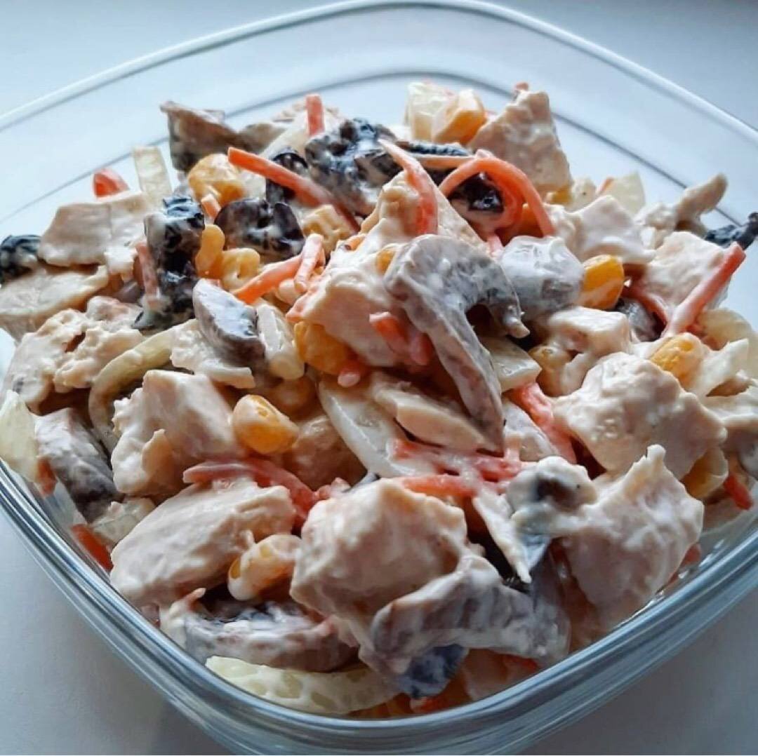 Любимый рецепт моего мужа #святковеменю Ингредиенты: куриное филе, шампиньоны, морковь по корейски , кукуруза , чернослив , майонез, уксус , соль, сахар , растильное масло, луковица Способ приготовления: Филе отварить до готовности, остудить и нарезать кубиками Лук нарезаем полукольцами, залить кипятком на 10 минут. Слить воду и добавить (на 1 луковицу) 1-2ч.л. сахара и залить уксусом немного. Оставить на 30 минут мариновать. Грибы нарезать на пластины и обжарить на раст.масле, солим, перчим. Чернослив нарезать кубиком, морковь немного измельчить. Смешать куриное филе, шампиньоны,маринованый лук, чернослив, кукурузу,корейскую морковь. Заправить майонезом. Если нужно досолить по вкусу. Приятного аппетита!