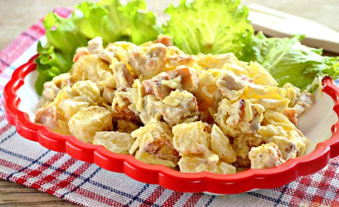 Салат к новогоднему столу "Ностальжи" Ингредиенты: Куриное филе 450-500 г Сухари 1 пакетик (желательно со вкусом курочки) Сыр твердый 200 г Чеснок 2 зубчик Грецкий орех 3 шт. Майонез 4-5 ложки Соль, черный перец (по вкусу) Способ приготовления: Филе курицы отварить в подсоленной воде, затем нарезать кубиками. Сыр потереть на крупной терке, дольку чеснока пропустить через чеснокодавилку, грецкий орех измельчить и перемешать. Все ингредиенты соединить, заправить майонезом. Перед подачей добавить сухари. Приятного аппетита!
