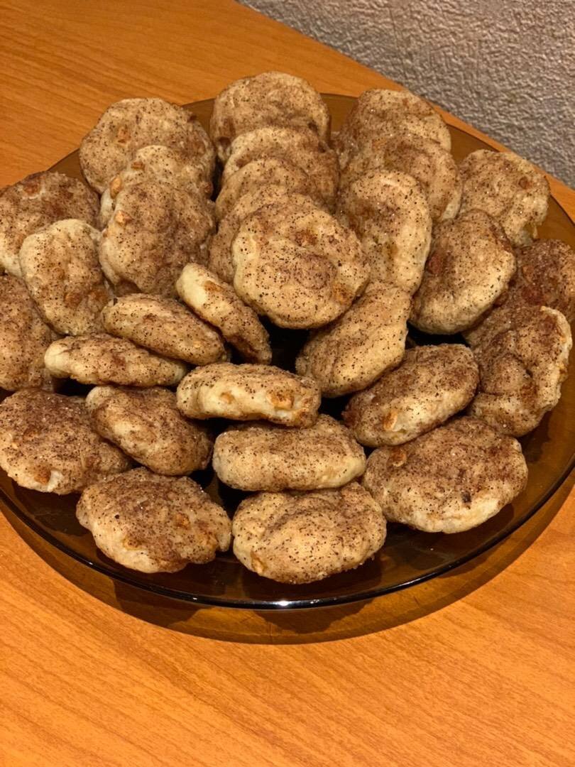 Печенье получается как мягкие бисквитики. Ингредиенты: творога (1 пачка), сливочного масла размягчённого, соли, сахара, яйцо, яблока маленьких, муки, разрыхлителя теста, Для обсыпки:, сахара, корицы Способ приготовления: Сливочное масло надо достать заранее, чтобы оно стало мягким. Но если масло надо срочно размягчить, то ставим в микроволновку мощность 30, на 1 минуту. Творог растираем с размягчённым сливочным маслом. Добавляем яйцо, щепотку соли, сахар и перемешиваем. Насыпаем 100 гр просеянной муки с разрыхлителем теста и перемешиваем. Яблоки очищаем, мелко нарезаем и добавляем в тесто. Теперь тесто вымешиваем рукой, добавляя оставшуюся муку. Тесто должно собраться в комок. Руками формируем из теста небольшие шарики, размером с грецкий орех. Соединяем сахар с корицей. Обмакиваем каждый шарик теста со всех сторон и немного придавливаем. Выкладываем творожные печеньки на противень, выложенный бумагой для выпечки. Выпекаем в разогретой до 180 градусов духовке около 20 минут до готовнос