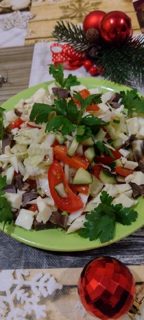 #святковеменю Ингредиенты: свежих огурца, черри, пекинской капусты, лук, сулугуни, куриных желудка, оливковое масло, Уксус, петрушка для украшения, Растительное масло, соль Способ приготовления: Желудки отварить в течении 35-40 мин и обжарить на растительном масле, порезать на маленькие кусочки, лук мелкими кубиками Сулугуни огурец капусту порезать кубиками 🍅 помидоры дольками все ингредиенты соединить посолить заправить оливковым маслом сбрызнуть уксусом перемешать украсить петрушкой
