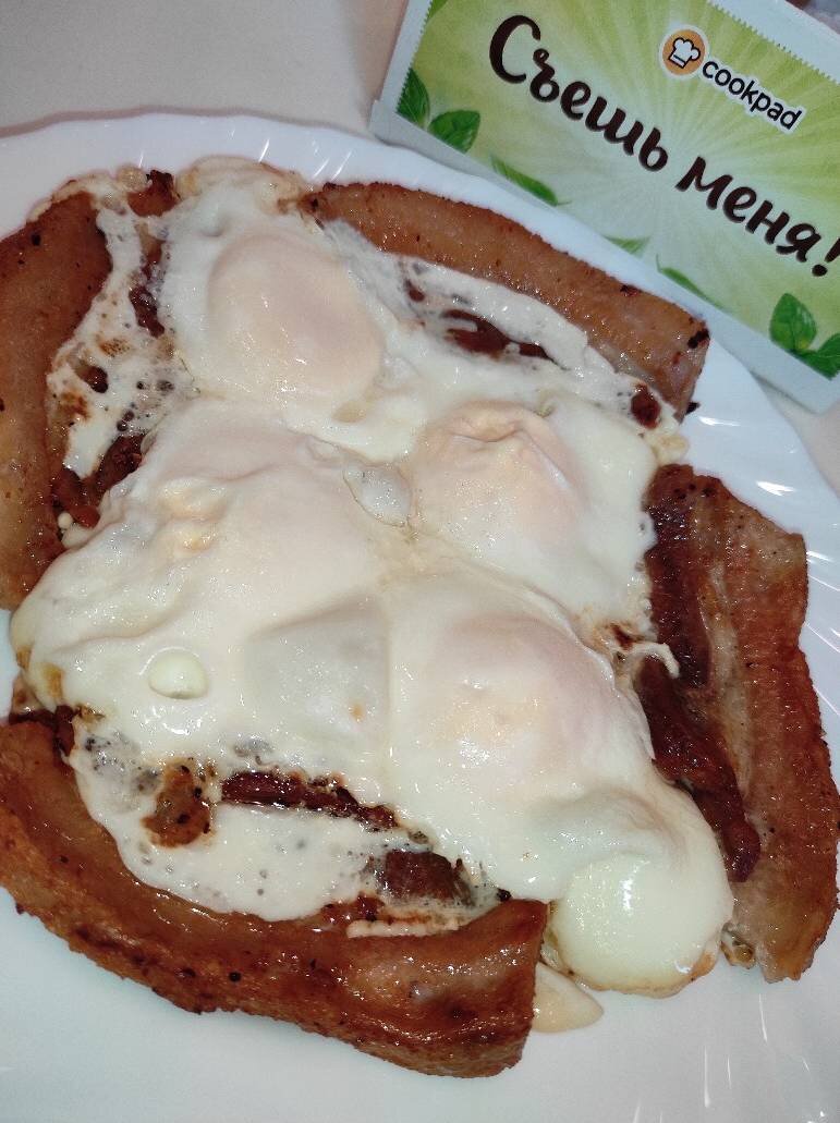 #завтрак #яичница #готовитolya_vas Ингредиенты: грудинка (полоски) , яйца, Соль, перец, Растительное масло для жарки Способ приготовления: Грудинку посолить, поперчить, обжарить на раскаленной сковороде с растительным маслом с одной стороны. Перевернуть на другую сторону. В центр разбить яйца, посолить, накрыть крышкой. Довести до готовности. ПРИЯТНОГО АППЕТИТА!