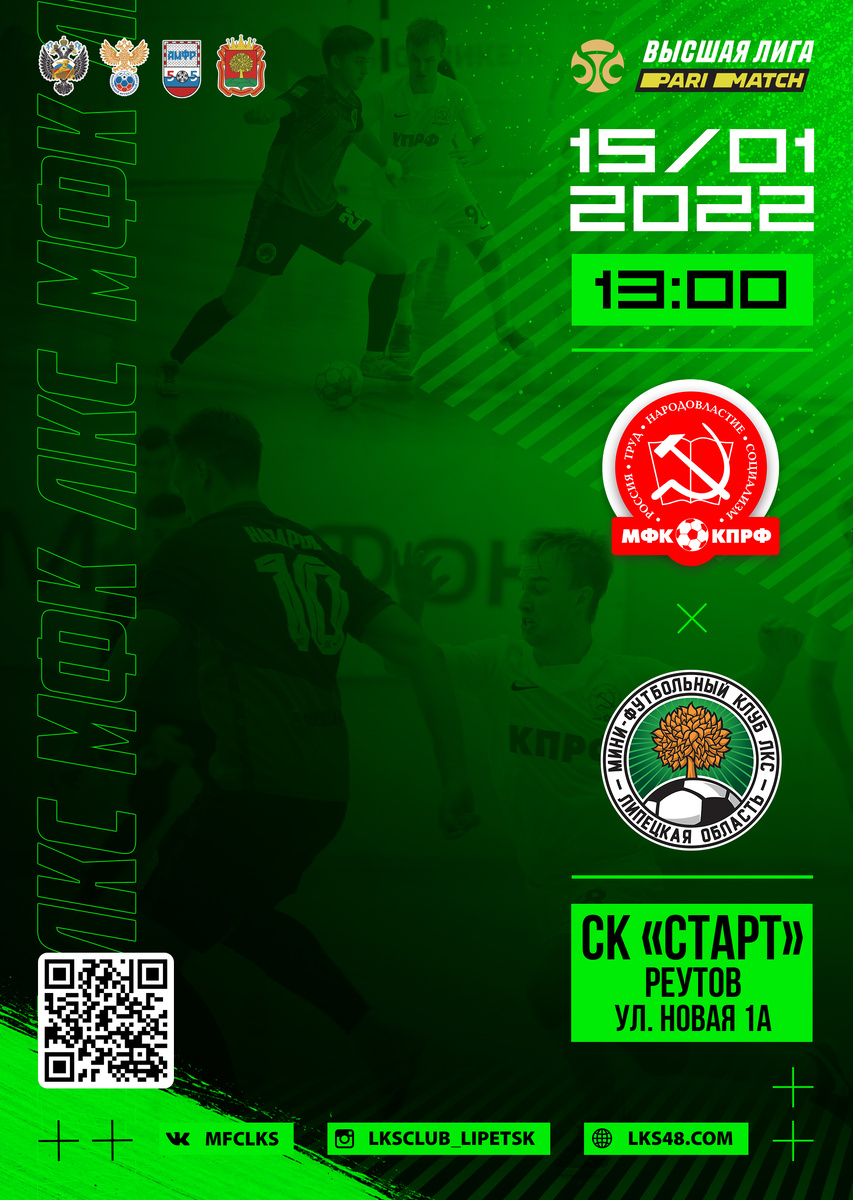 Представляем ближайшего соперника, вспоминаем историю противостояния команд Первый матч в 2022 году мини-футбольный клуб ЛКС проведёт в Реутове с СК «КПРФ-2». Игра состоится в субботу, 15 января, в СК "Старт". Начало матча в 13:00 (мск). Соперник после 14-го тура занимает 4-е место в таблице Париматч-Высшей лиги. История команды