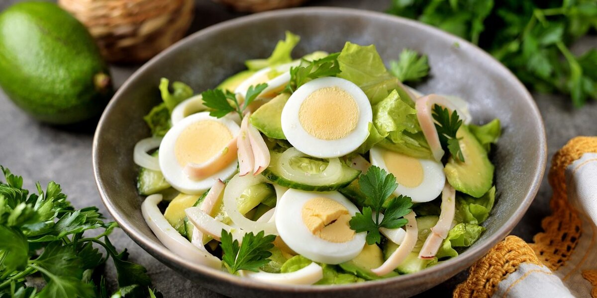 Приготовьте этот освежающий салат к праздничному столу ведь вереница зимних праздников еще не закончилась. Ваши гости будут поражены совершенным сочетанием ингредиентов Салат кальмарами и авокадо Ингредиенты – 300 граммов кальмаров 2 тубуса – 1 авокадо – 10 штук перепелиных яиц – 2 свежих огурца – обжаренный кунжут – кинза Для соуса – 10 граммов соуса сладкий чили – 20 миллилитров соевого соуса – 20 миллилитров оливкового масла – щепотка соли Приготовление Разрежьте тубусы кальмара, очистите от кожуры и нарежьте прямоугольники. Острым ножом сделайте надрезы 1 – 2 миллиметра. Отварите перепелиные яйца до готовности и почистите от скорлупы. Нарежьте огурцы, авокадо и яйца произвольными кусочками.