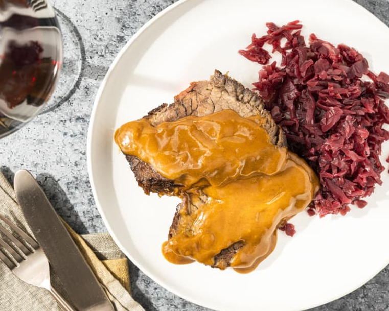 Sauerbraten — это немецкое блюдо, означающее «кислое» или «маринованное» жаркое. Ростбиф или верхняя часть говядины маринуются в течение нескольких дней в смеси уксуса и специй. Это смягчает и придает аромат говядине.