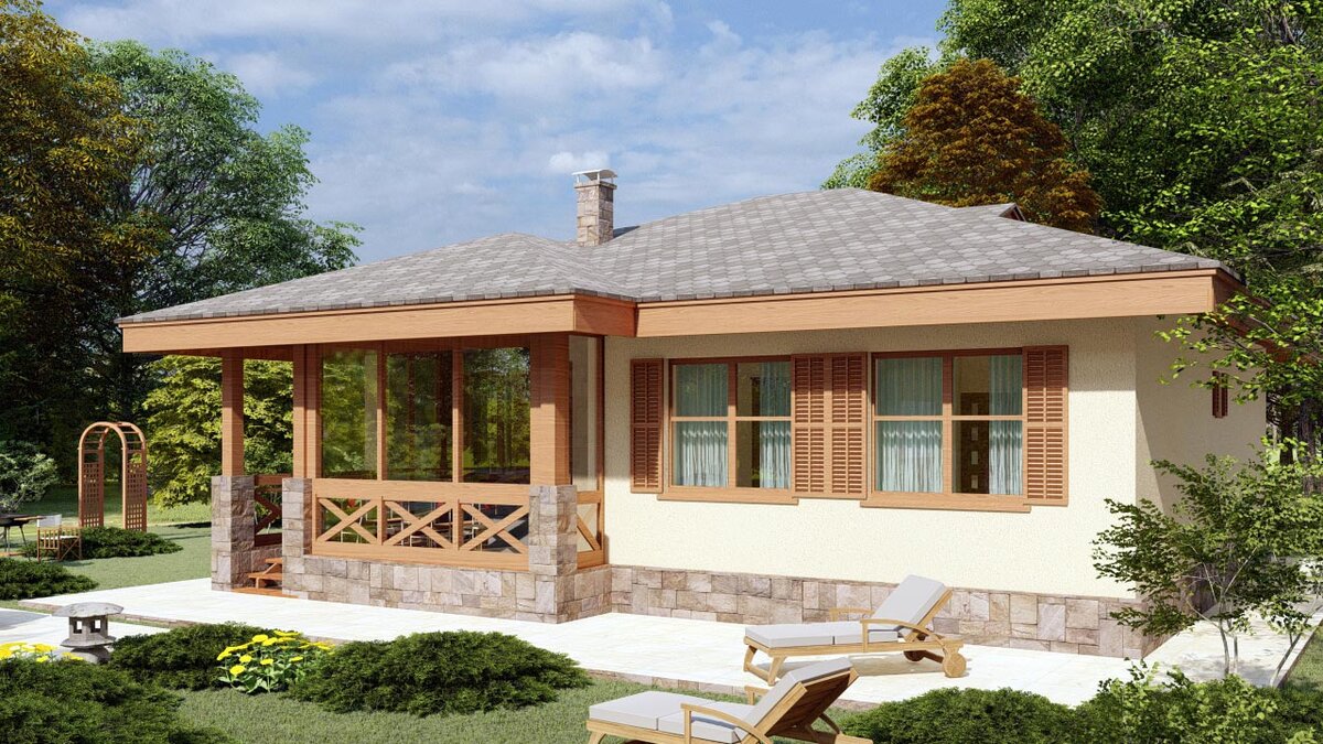 Проект одноэтажного дома КРАСНОДАР выполнен в стиле южно - русского сельского жилья, - под четырехскатной крышей, с небольшой террасой при входе и с романтичными ставнями на окошках. Он будет гармонично выглядеть и на открытом участке, и в саду. КОМПАКТНАЯ ПЛАНИРОВКА Проект рассчитан на строительство дома в дальнем конце участка. 👇 Подборки проектов для строительства в глубине Боковой и задний фасады, ориентированные на чужой участок, не имеют окон, а вход совмещён с террасой для отдыха. Глубину террасы можно увеличить, без корректировки чертежей. Несмотря на небольшую площадь коттеджа, в нём удалось соблюсти правильное взаиморасположение помещений – жилые комнаты удалены от общих комнат, а при желании можно разделить холл перегородкой с дверью и совсем изолировать личные комнаты. Коттедж спроектирован так, чтобы максимально упростить поддержание в порядке инженерного обеспечения и механизмов: в нём одна входная дверь, одна остеклённая (или не остеклённая) веранда, один сантехнически