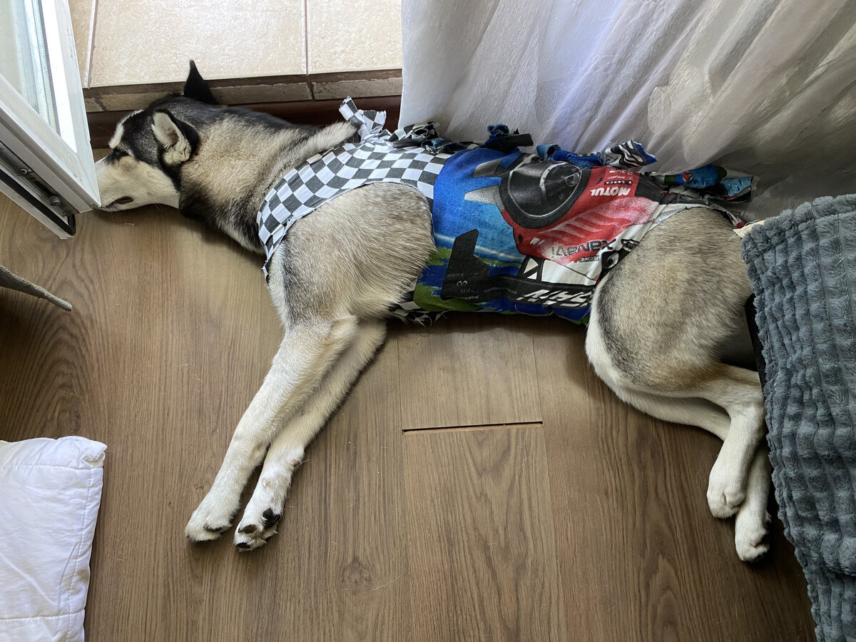 Когда Эске исполнилось 7 месяцев, мы начали готовиться к операции. Сдали необходимые анализы и еще раз поговорили с врачом. Выполнили полную стерилизацию (удалили матку и яичники). Операция прошла успешно, быстро, без каких-либо негативных последствий. 2 недели Эска ходила в попонах, которые я обновляла каждые 4-5 дней, ведь неугомонная #хаски постоянно жевала завязки и рвала ткань :)