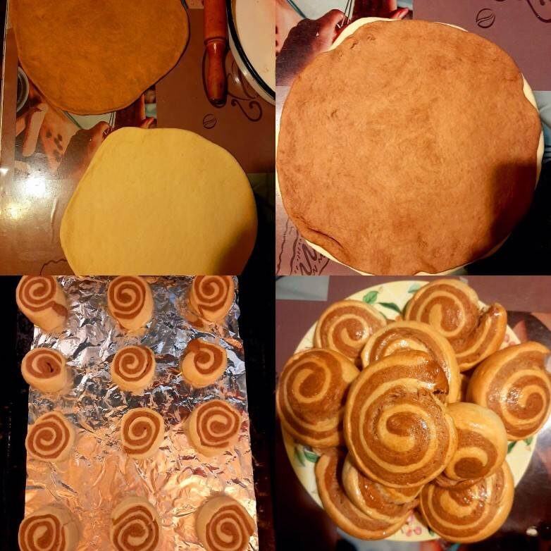Этот рецепт узнал случайно. Получаются мягкие и воздушные улитки. #быстро Ингредиенты: муки, какао (я добавлял Несквик), сахара, дрожжей, Растительное масло, Ванилин, яйцо, Теплая вода, я лью всегда на глаз. Тесто должно получиться упругим Способ приготовления: Насыпать муку в одинаковом количестве в две миски. В одну миску добавляем какао, в другую добавляем ванилин. Замешиваем тесто, раскатываем круги и поочередно укладываем слоями, затем скручиваем рулет, режем порционно (я резал на глаз) отправляем в духовку при 180 градусах выпекаем до готовности, готовность я проверяю зубочисткой. Если она сухая, значит улитки готовы. Приятного аппетита).