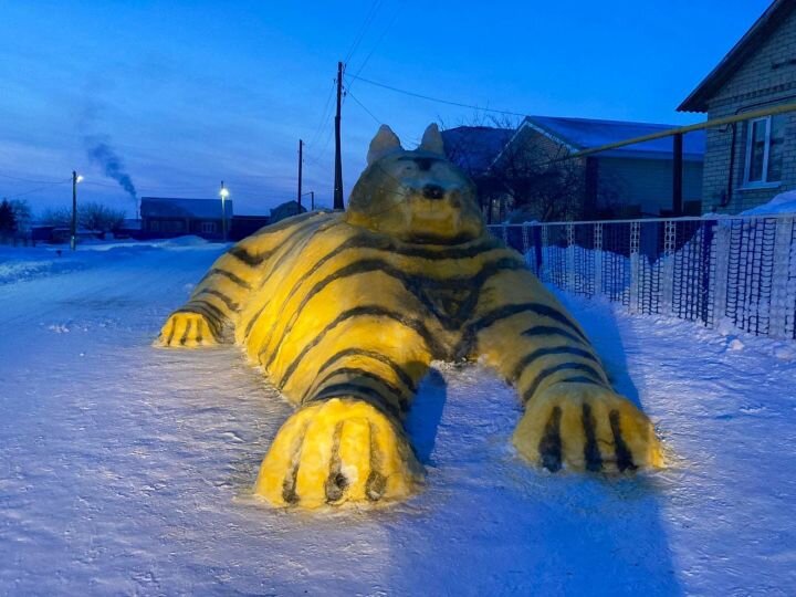 В селе Аккиреево возле дома семьи Сипатровых можно увидеть огромного снежного тигра – символа 2022 года. Желтого симпатичного тигра в основном лепили Александр Сипатров и Данила Мензелин, им помогали их друзья Антон Прокопьев и Владислав Калмыков. Почти 8 метровый тигр стал украшение села на новогодние праздники, а фото в «ВКонтакте» набрало уже 175 лайков и 23 комментария. К слову, аккиреевцы и в этом году празднично украсили территорию сельского дома культуры и заняли второе место в районном конкурсе. Подробнее: http://nashcheremshan.ru/news/v-nashem-rayone/v-akkireevo-slepili-ogromnogo-tigra