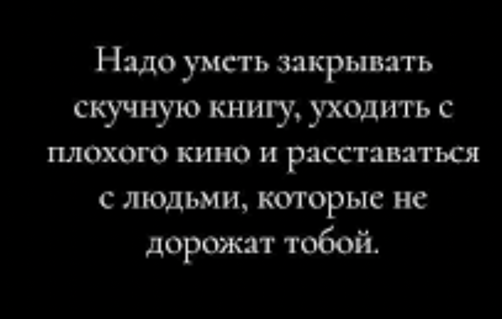 Не нужно жить с таким человеком, который в чем-то тебя не устраивает. Нужно жить так, чтобы в конце жизни не жалеть о том, что у тебя происходило в жизни. Например я не дочитываю книгу, которая кажется мне скучной, потому что считаю, что это пустая трата времени и это совершенно не правильно. Я не смотрю в кинотеатре те фильмы, которые мне не нравятся. Только потому что я заплатила за это деньги.
