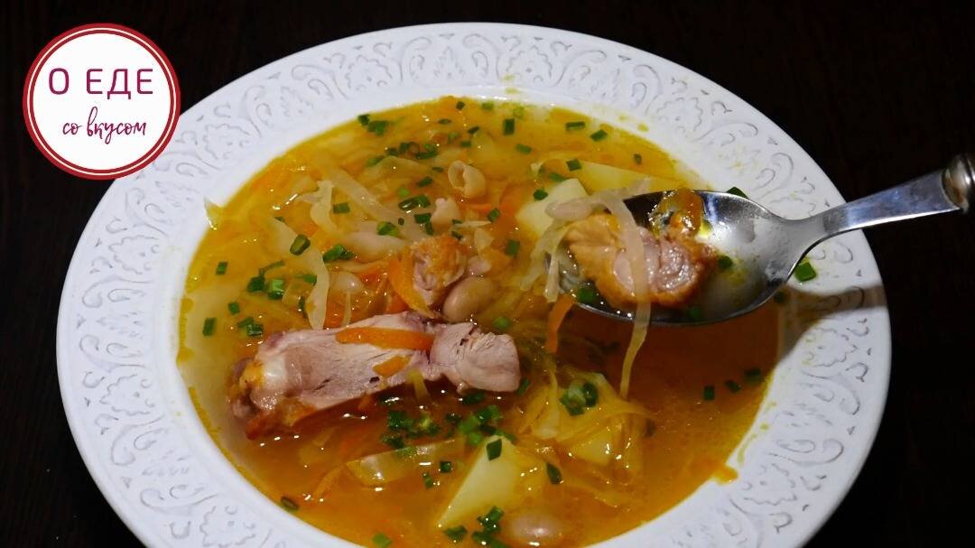 Ингредиенты: бульон говяжий, квашеная капуста, фасоль консервированная белая, картофель, копчёная куриная ножка или бедра, лук, морковь, лавровый лист, соль, перец, чеснок, зелень для подачи