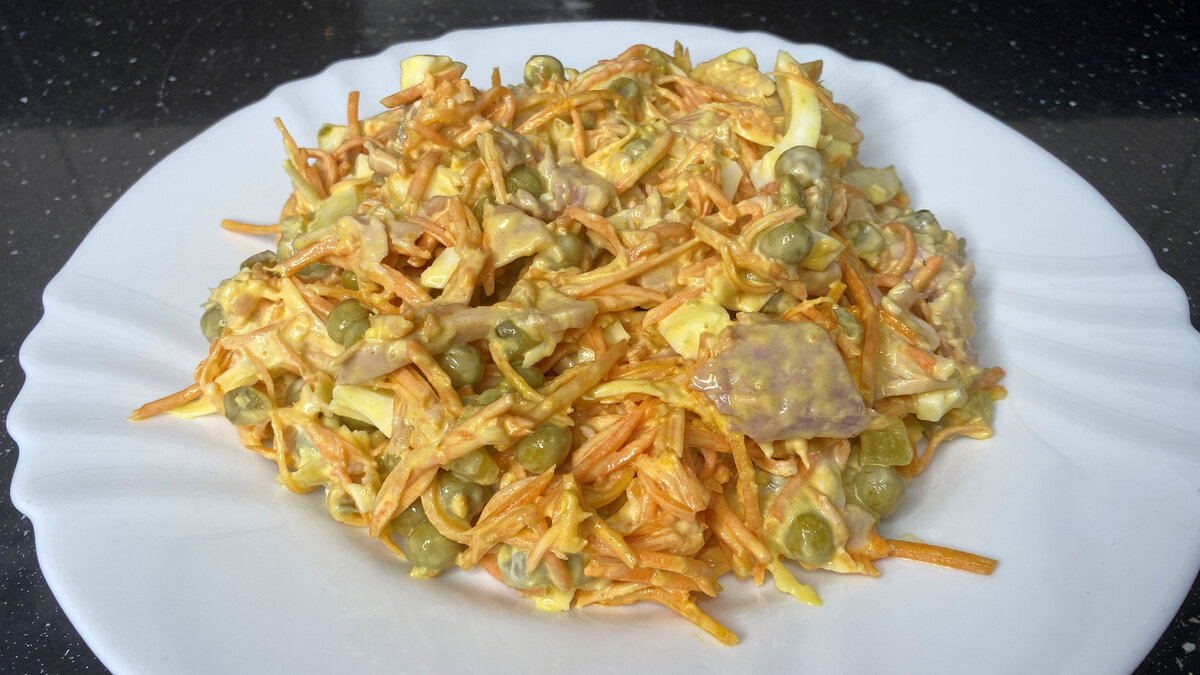 Салат с копченой курицей, морковью по-корейски и зеленым горошком.
