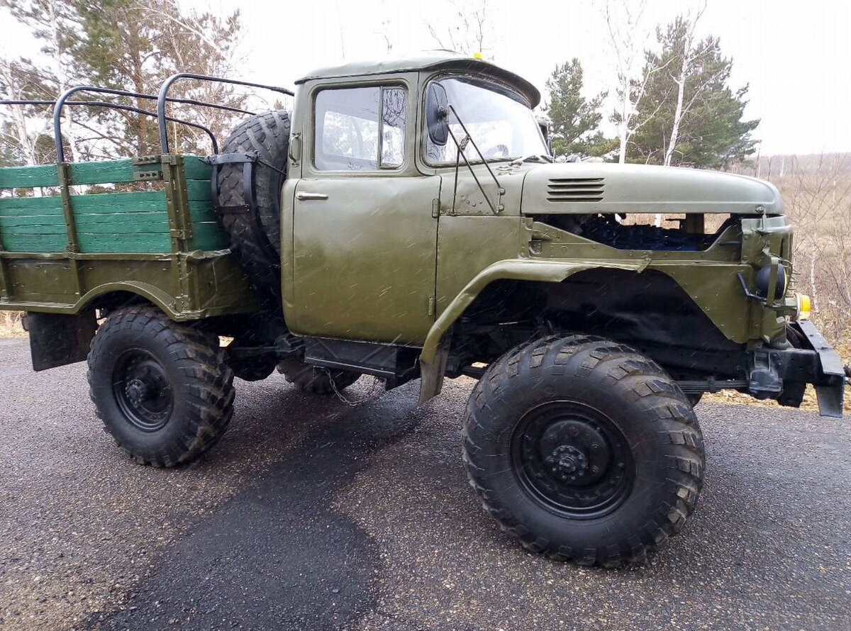 Вчера я провёл достаточно много времени на сайтах с объявлениями о продаже подержанных автомобилей, чтобы найти что-то любопытное для сегодняшней статьи. В итоге я остановился вот на этом самодельном грузовике, который мне показался забавным и интересным. Прямо сейчас он продаётся в Чите за очень внушительную сумму — 950 тысяч рублей. Продавец называет его самодельным трактором, но построена эта штука на базе укороченного шасси полноприводного советского грузовика ГАЗ-66. Мосты тут тоже от ГАЗ-66, как и обрезанная металлическая платформа с наращёнными деревянными бортами. Вместо оригинальной бескапотной кабины тут установлена кабина от ЗИЛ-130 с модифицированным оперением от амурского ЗИЛа. Зачем это нужно? Причин несколько. Первая — это более удобная посадка, когда за рычагом переключения передач не нужно тянуться себе за спину (известный компоновочный косяк ГАЗ-66). Еще одна причина — повышение плавности хода. Одно дело сидеть над передними колёсами, а другое — почти в центре шасси.