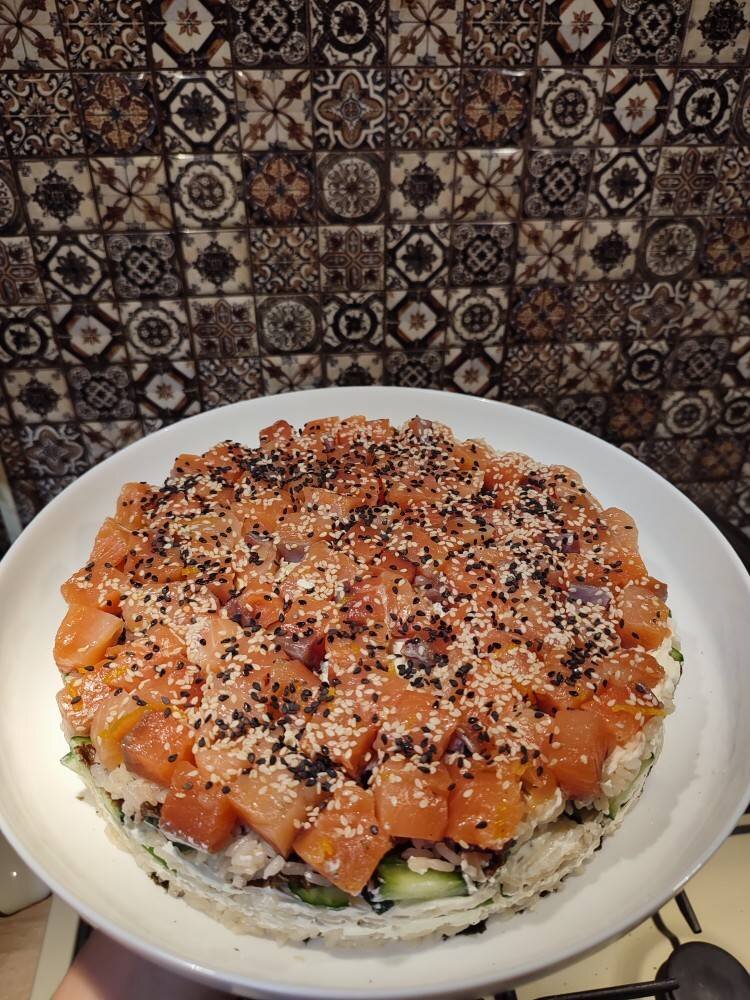Мега легко готувати та дуже приємно смакувати такі собі лениві суші.. #канікули #суші Ингредиенты: рису для суші, води, солі, цукру, рисового або яблучного оцту, невеликих огірки, середнє авокадо, листи норі, сиру філадельфія, кунжуту для прикрашання, слабосоленого лосося Способ приготовления: Приготуємо рис: добре його промиємо, наллємо 300мл води і поставимо на середній вогонь варитися під кришкою 15 хвилин. Приготуємо заправку для рису: 25мл оцету+пів чайної ложки солі+1ч.л.цукру нагріти, щоб розчинилася сіль та заправити наш рис, добре його перемішав дерев'яною лопаткою. Я ще додала до рису 1ст.л. соусу териякі. Приготуємо наші овочі: наріжемо авокадо тонкими слайсами, а огірки соломкою. Тепер збираємо наш тортик. Візьмемо формовочне кільце, обмотаємо харчовою плівкою та змащуємо маслом. На самий низ викладаємо лист норі, потім 1/3 ч.рису, потім 1/3ч.сиру філадельфія (викладати краще всього мокрою ложкою, щоб нічого не налипало. Всі слої добре притрамбовуємо, щоб наш тортик потім т