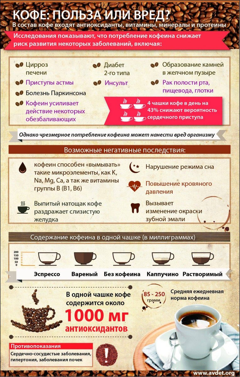 Большинство из нас не могут представить себе утро без чашки кофе. Кофе улучшает наше настроение, но если пить его в избытке, он может нанести серьезный вред. Кофеин, который содержится в кофе, является одним из самых доступных психотропных препаратов. Он улучшает наше настроение и придает бодрости. Исследователи факультета экспериментальной психологии Оксфордского университета придумали уравнение, позволяющее определить лучшее время для питья утреннего кофе. При расчете учитывался ряд факторов, включая освещение, музыку и аромат пива. Способы ... ...приготовления кофе... ...много Идеальное время для "кофе-брейка" - 11 часов утра. Эта формула рассчитана на людей, которые встают между 7 и 9 часами утра. Британский ученый обнаружил, что маленькой порцией черного кофе лучше всего наслаждаться в освещенной комнате или на природе при солнечном свете. В 11 часов наше вкусовое восприятие достигает своего пика. Кофе не следует пить в одиночестве, поскольку теплое варево заставляет нас видеть