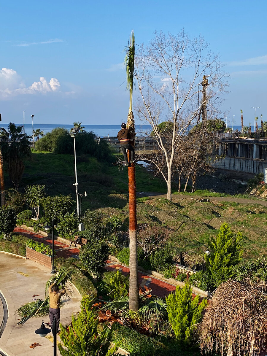 Ловко орудуя тесаком или чем-то похожим, он срубал ветки с пальмы. Мы подумали может старые ветки удаляют или пальма «болеет» и так оказывают какую-то помощь, мы не поняли, но судя по всему это было необходимо для нее. Спустя пол дня, выходя на улицу, первое что встретили, это кучи пальмовых ветвь на асфальте. И «голенькие» пальмы на всей территории комплекса😅 Позже узнали, что это своего рода уборка и подготовка к летнему сезону. Так, в скором времени вырастут новые, красивые и зеленые ветви. И несмотря на то, что со временем нижние ветки подсыхают и отмирают, а в последствии обрезают только их, у нас же обрезали почти все, оставив лишь верхушку🤷🏻 Хотя на наш, далеко не профессиональный взгляд, много веток валявшихся на асфальте, были в хорошем и здоровом виде, но может и ошибаемся.