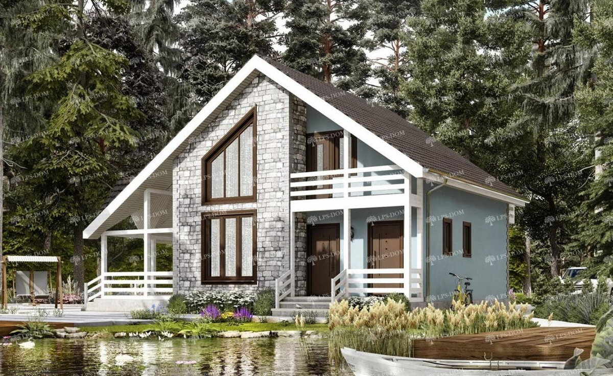 Каркасный дом "Монреаль" от строительной компании "LPS-DOM". Площадь застройки: 12 x 9 м, Общая площадь: 195 м2, стоимость: от 3 940 000 руб. По планировке: на первом этаже есть большая кухня-столовая-гостиная, спальня, санузел, бойлерная и тамбур с холлом. Также имеется две террасы: одна небольшая на 4 м2, другая на 18 м2. Соответственно входа в дом также два. На втором этаже расположены две спальни, большой санузел, гардероб, балкон и просторный холл со вторым светом.