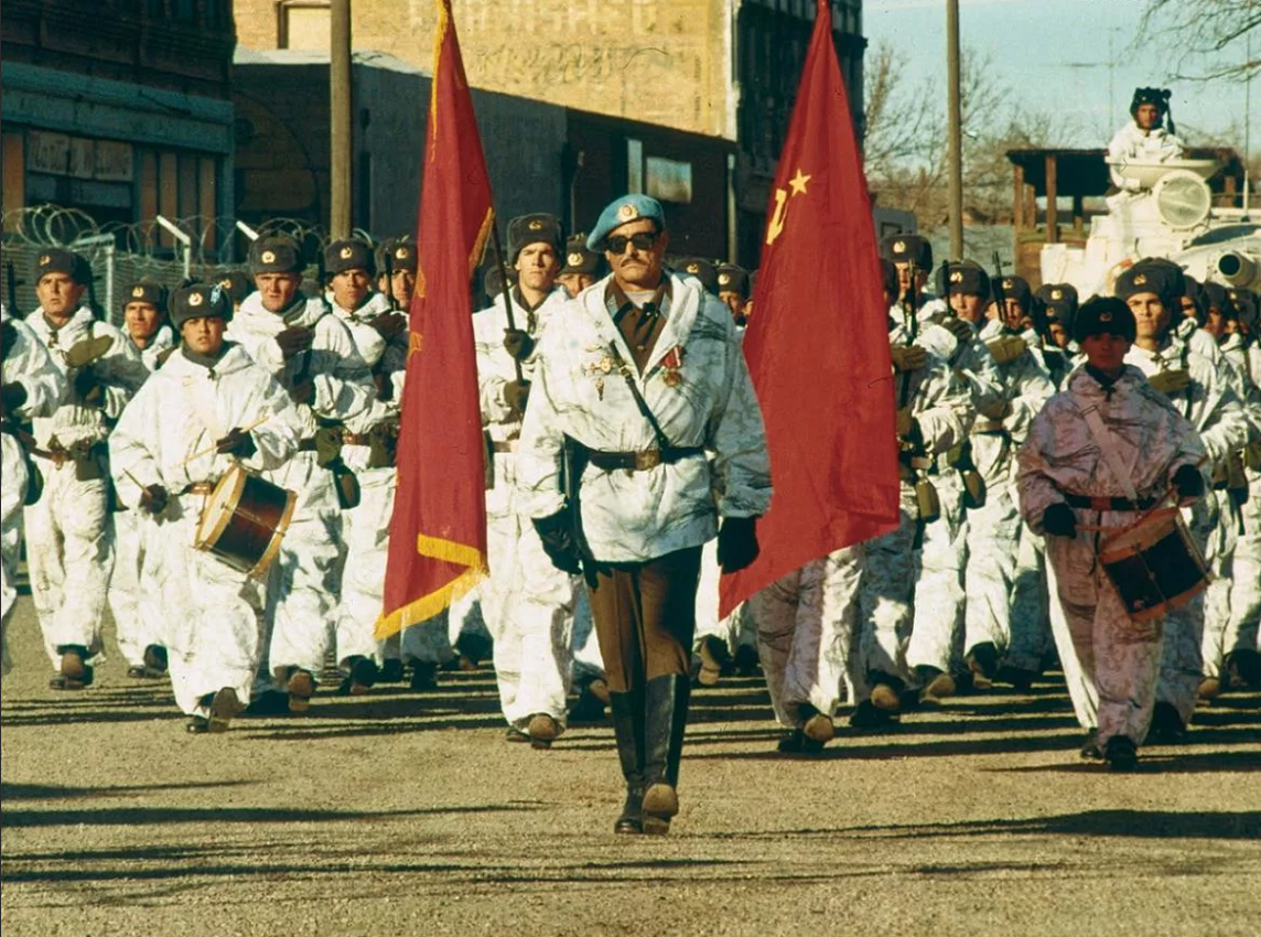 Про один такой характерный образчик американского пропагандистского кино мы сегодня и поговорим. Итак встречайте, фильм 1984 года "Красный Рассвет". Фильм начинается с закадрового текста с вводной мира этого фильма. Итак оказывается Советский Союз уже 55 лет угрожает всему миру. При этом сама страна страдает от неурожая пшеницы. Беспорядки от голода и безработицы в Польше, ага в 1984 году. и Советский Союз вводит туда свои войска. Куба и Никарагуа значит увеличивает численность своих войск, захватили Сальвадор и Гондурас. Партия зеленых, контролирует парламент в Западной Германии и требует вывод ядерного оружия которое понаставило там США, вообще из Европы. Да как они вообще посмели на "демократию" так покусится. В Мексике кровавые большевики начали революцию. НАТО о ужас какой распалось и добрые и демократические американцы остались одни. Далее идут титры под пафосную патриотическую музыку.