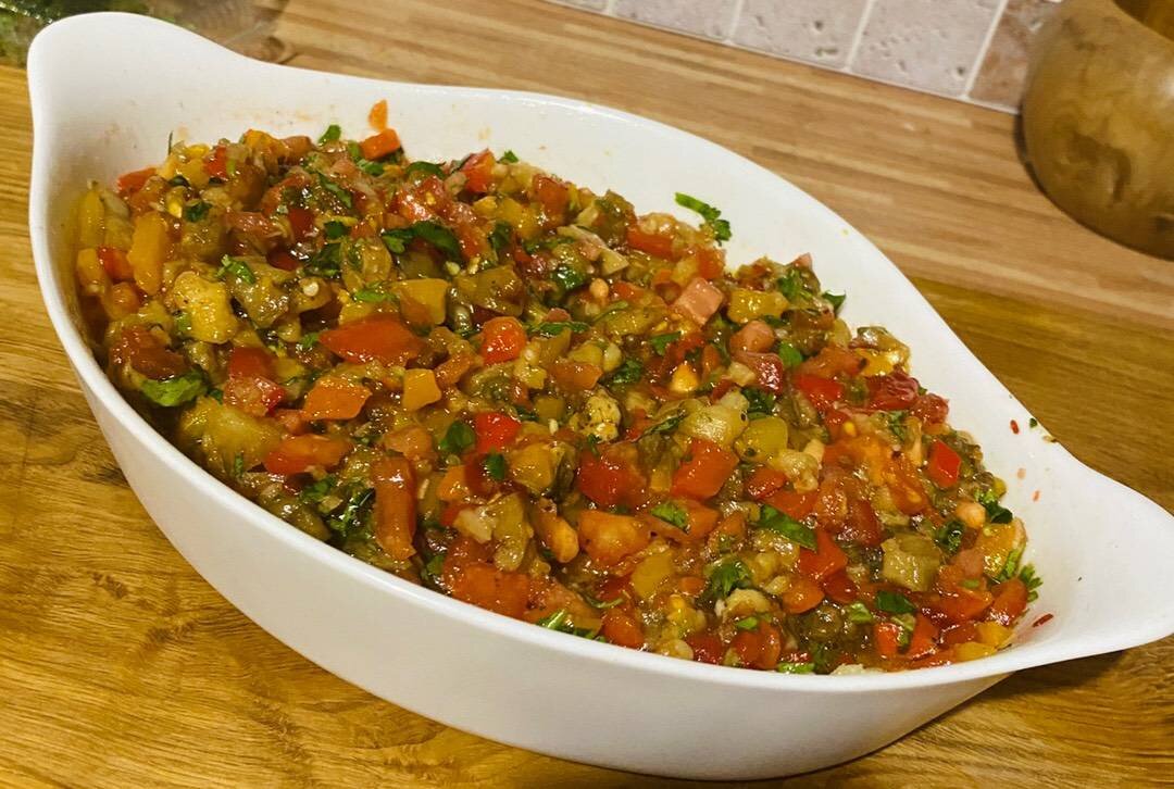 Ингредиенты: баклажана, болгарских перца, помидора, чеснока, острого перца, кинзы, соль, чёрный перец , бальзамического или яблочного уксуса, оливкового или растительного масла Способ приготовления: Баклажаны и перец накалываем вилкой, немного поливаем маслом и отравляем в духовку при температуре 200- 220 гр до мягкости. Немного остужаемся и освобождаем овощи от кожуры. В помидорах делаем надрезы и заливаем кипятком и далее освобождаем от кожуры. Все мелко режем, чеснок трём на терке, перец острый мелко режем, кинзу также Мешко режем. Добавляем соль, масло, уксус и все перемешать, для того чтобы сбалансировать вкус можно добавить немного сахара. Приятного аппетита 😋.