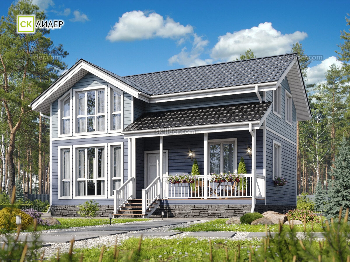 Каркасный дом "Алтай" от строительной компании "СК ЛИДЕР". Площадь застройки: 7 x 10 м, Общая площадь: 120 м2, стоимость: от 4 627 000 руб. #Коттедж «Алтай» имеет стильный и оригинальный дизайн, а его продуманная и уютная планировка позволит с комфортом разместиться всем членам семьи. В данном проекте предусмотрены четыре спальни, одна из которых расположена на первом этаже, просторная гостиная, совмещенная с кухней, два больших сан. узла, тепловой тамбур, кладовая и крыльцо. Связывает этажи дома удобная двухмаршевая лестница. В комплектацию дома входит терраса, которую при желании можно увеличить.