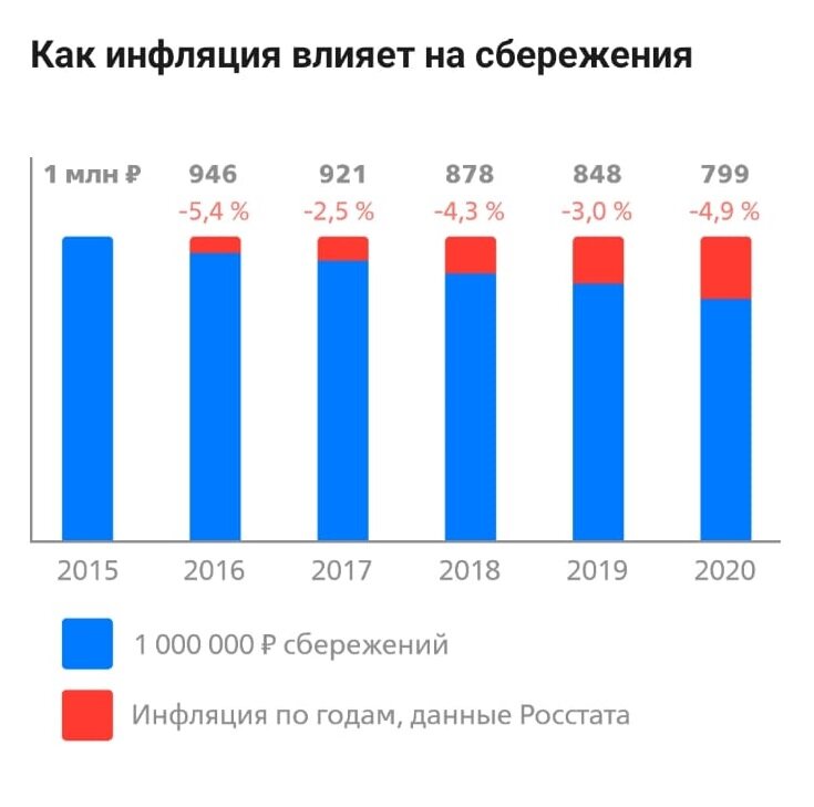 на 760 000 ₽. С инвестициями же ситуация другая. Доходность по инвестициям может обгонять инфляцию. Например, вот данные по доходности за 5 лет: Кроме того, если вы открываете индивидуальный инвестиционный счет (ИИС) и в течение года покупаете на него акции, облигации и другие активы, то сможете получить не только доход от активов, но и налоговый вычет до 52 000 ₽* в год. Это тоже солидная прибавка, которая позволит обогнать инфляцию. Так что как минимум инвестировать нужно, чтобы не терять на инфляции. Почему вклад и недвижимость не защитят деньги Чтобы защитить деньги, в России чаще всего просто кладут деньги на вклад или покупают недвижимость. Вклады. Если бы вы положили этот миллион на вклад, то деньги бы не потеряли, но и ничего не заработали — процент по вкладу чуть больше официальной инфляции. Рост цен на товары и услуги в последние годы