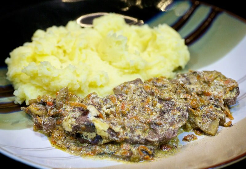 Куриная печень с грибами – отличное решение для легкого ужина. Это нежное блюдо под сметанно-мускатным соусом отлично подойдет к гарниру из гречки или картофеля. Я люблю куриную печень за ее текстуру и легкость в приготовлении. Однако, если по каким-то причинам она вам не нравится или ее нет, то это блюдо можно приготовить из говяжьей печени, просто нарежьте ее на более мелкие кусочки. Так как это блюдо мы готовим сначала на плите, а потом запекаем, поэтому возьмем для него сотейник или сковороду со съемной ручкой. Ингредиенты: Приготовление: Подготавливаем ингредиенты. Очищаем лук, нарезаем его полукольцами, а затем обжариваем до золотистого цвета, время от времени перемешивая (8-10 мин). Пока жарится лук очищаем морковь, натираем ее на крупной терке. Затем добавляем морковь в сковороду, после чего часто перемешивая, обжариваем вместе с морковью еще 5 минут. Очищаем (я также снимаю кожицу) и нарезаем грибы ломтиками, добавляем их в сковороду, обжариваем все вместе, пока не испарится ж