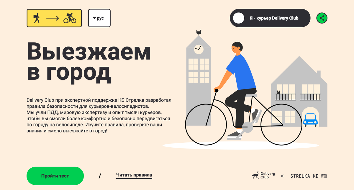 Программа подготовлена на четырех языках и находится в открытом доступе — воспользоваться ей для обучения курьеров смогут любые сервисы доставки еды. Крупнейший в России сервис доставки еды Delivery Club при экспертной поддержке консалтинговой компании КБ Стрелка подготовил программу обучения велокурьеров. Программа находится в открытом доступе на сайте velo.delivery-club.ru и доступна на русском, узбекском, киргизском и таджикском языках. Доступный формат образовательной программы позволит курьерам подготовиться к работе в городе на велосипеде, повысить безопасность движения как самих курьеров, так и других участников дорожного движения.