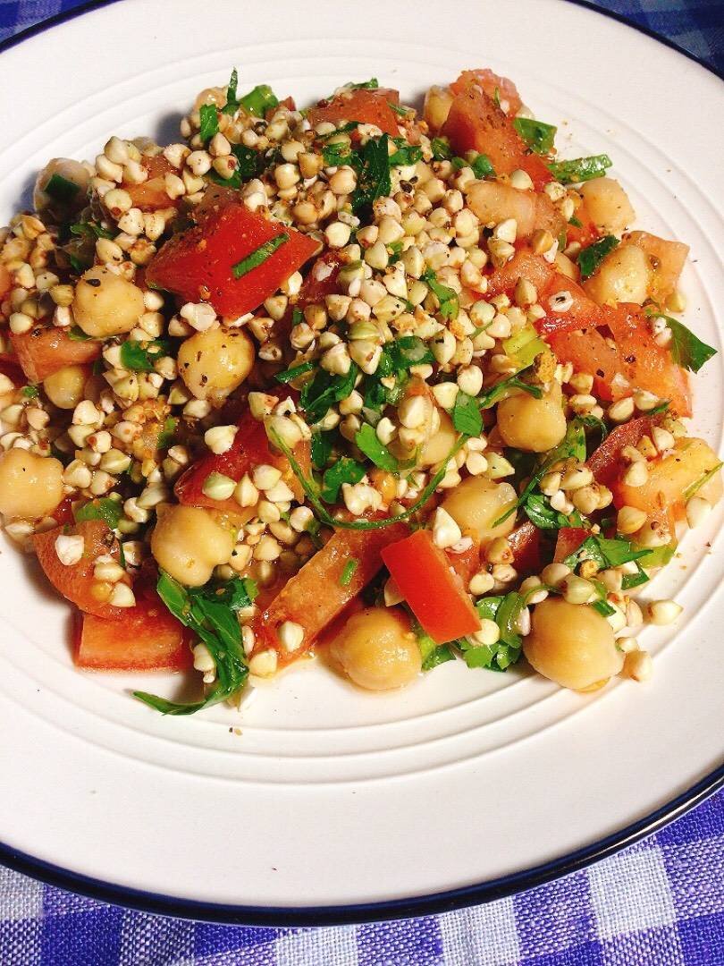 Ингредиенты: Зелёная гречка, Нут отварной, Петрушка, Чеснок, Зелёный лук, Томаты, Сок лимона, Оливковое масло, Соль, перец Способ приготовления: 1 стакан зелёной гречки промыть и замочить на ночь, просушить Перемешать: петрушку, чеснок, зелёный лук, томаты, нут отварной 1 стакан, сок 1/2 лимона, 3 ст. л. оливкового масла, соль, перец. Добавить к овощам зелёную гречку, перемешать.