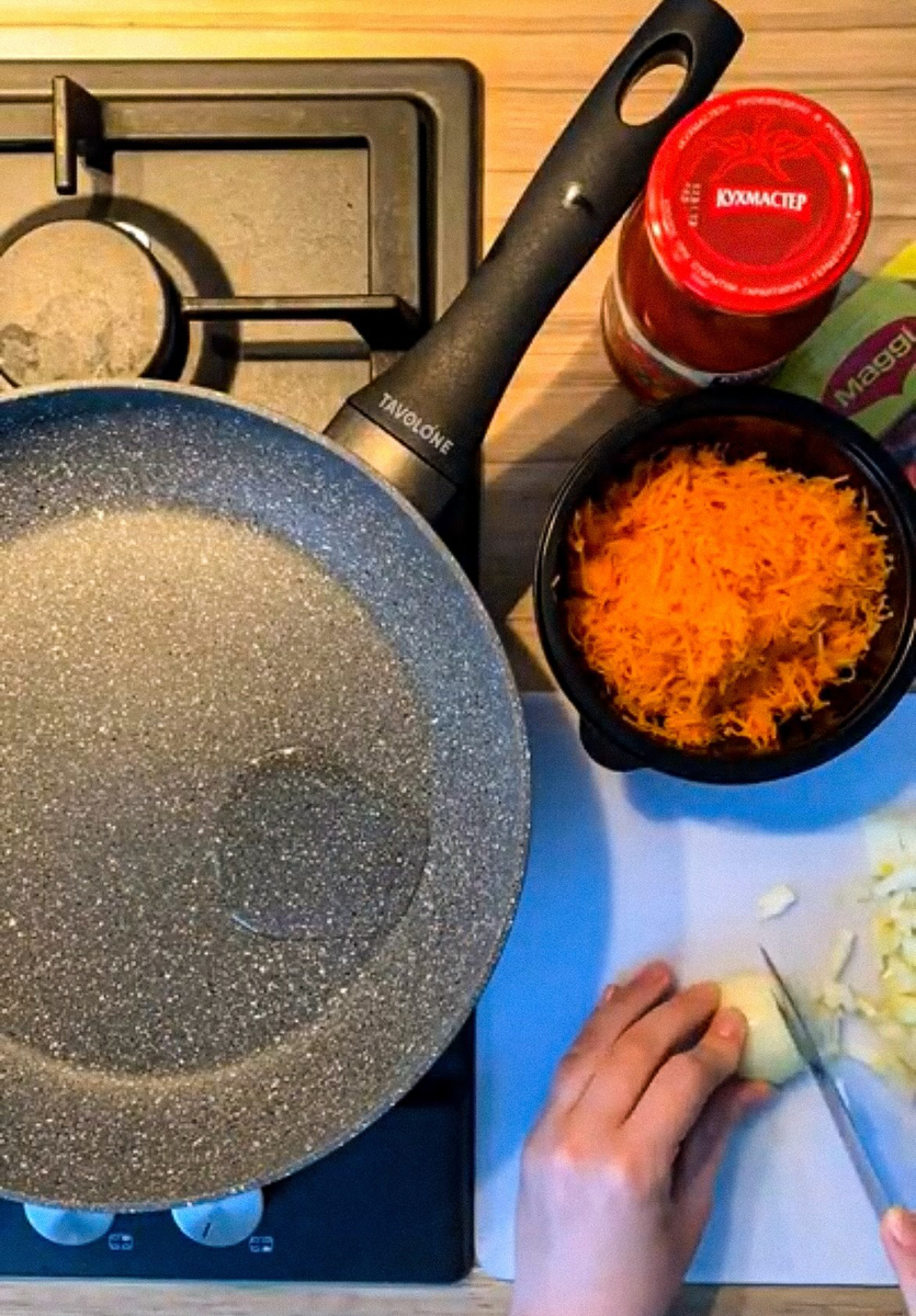 Приступаем к приготовлению. Мелко нарезаем лук и отправляем его на сковородку обжариваться в раскаленной сковородке.