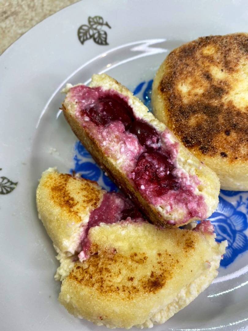 Ингредиенты: творог, желток яичный, сахар, крупа манная, масло растительное, вишня без косточки Способ приготовления: Творог, желток и сахар пробить блендером. Добавить манную крупу и размешать, убрать тесто в холодильник на 15 минут. Рабочую поверхность посыпать манкой. От теста отделить кусок, руками скатать в шар, затем расплющить и положить вишню 2-3 ягодки, снова скатать в шар и немного обвалять в манной крупе. Шарик выложить на ровную поверхность и сформировать шайбочку. Удобно это делать ножом с широким лезвием и рукой: крутить сырник между лезвием ножа и рукой, расположенных параллельно. Затем лезвием ножа приплюснуть верх. Получится аккуратная форма сырника в виде шайбы. Сковороду разогреть с небольшим количеством растительного масла на среднем огне. Выложить сырники и обжарить с двух сторон до красивого румяного цвета на умеренно-среднем огне. Затем готовить под крышкой ещё минут 5.