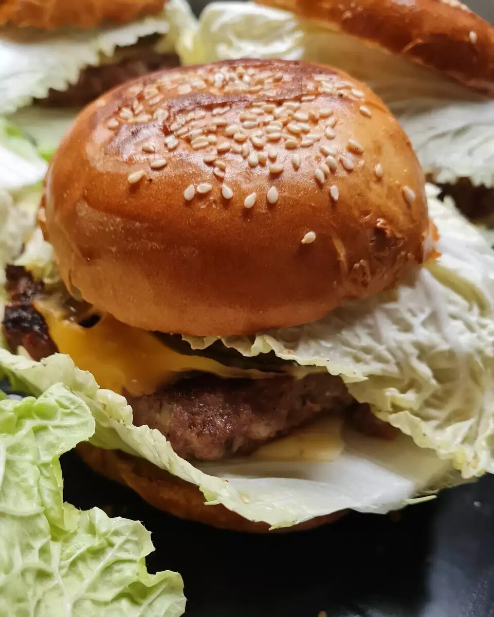 Собираем чизбургер. На нижнюю часть булочки кладём лист пекинской капусты + соус сырный + ломтик сыра+ котлета с сыром + маринованные огурцы + маринованный лук + соус сырный + лист пекинской капусты. Накрываем верхней частью булочки и готово! Так проделываем со всеми булочками.
