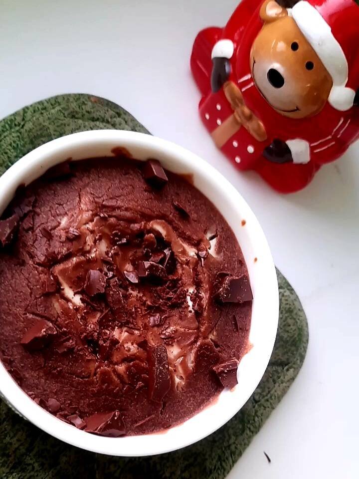 Перелить в жаропрочную форму и в середину вылить оставшийся йогурт или положить шоколад.