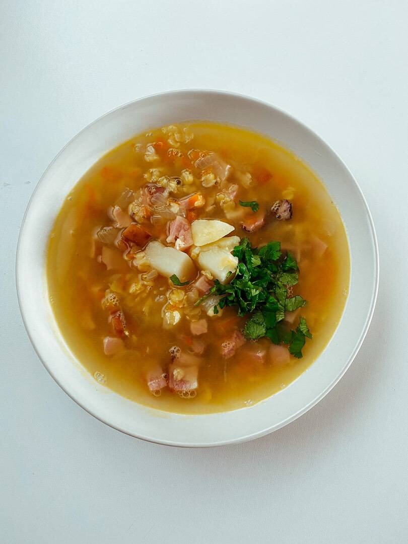 С’иглино - это Критское копченое блюдо из свинины. Мясо маринуют в жире получившемся в процессе приготовления свинины. Этот способ позволяет сохранить мясо в течение долгого периода времени. #гороховыйсуп #суп #копчености Ингредиенты: лущёный горох, вода, луковица, морковь, ст.л растительное масло, картофель, бекон, сиглино (вы можете использовать любое другое копченое мясо на ваш вкус), мясной бульонный кубик (по вкусу), соль, перец, петрушка (для сервировки) Способ приготовления: Горох залить горячей водой и оставить замачивать на 4-6 часов (я оставила на всю ночь). Промыть горох в холодной воде, выложить в кастрюлю и залить двумя литрами воды. Довести до кипения, далее убавить огонь и варить от 30 до 60 минут (зависит от сорта гороха, мой сварился за 30 минут). Пока горох варится, нарезать бекон и копченое мясо мелкими кубиками и выложить в кастрюлю с бульонным кубиком. Если вода начинает выкипать, добавьте горячей воды. Лук нарезать мелким кубиком, морковь натереть на тёрке и обжар