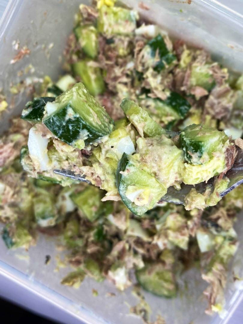 #быстро Ингредиенты: Тунец, Огурец, Авокадо, Яйцо, Сметана, Соль Способ приготовления: Тунец промять. Яйца сварить. Огурец, авокадо и яйца нарезать. Все смешать вместе со сметаной и солью по вкусу.