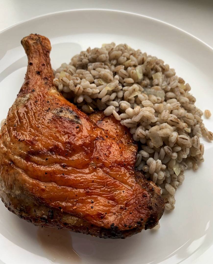 Ранее ела только диких уток, а домашнюю пробовала впервые. По сравнению с дикими, домашняя - жирнее, но мягче. Я использовала аэрогриль, но и духовка подойдет с такими же параметрами (я про градусы). Мариновать утку лучше более двух часов, но если нужно приготовить все быстро, то готовьте сразу. Перловая каша очень полезна, особенно при употреблении жирной пищи. Замачивать ее можно и не всю ночь, а 2-3 часа, но варить придется дольше. #утка #птица #рождество #ужин #окорочок #окорок #ножка #голень #праздничныйстол #длясемьи #кгарниру Ингредиенты: Утиный окорочок, Маленькая репчатая луковица, Соль, Молотый черный перец, Оливковое масло, Перловая каша, Перловки, Соль, Растительное масло, Маленькая репчатая луковица Способ приготовления: Окорок помыть, обсушить, сделать несколько надрезов ножом в коже и натереть солью с перцем. Затем смазать оливковым маслом. Лук нашинковать тонкими четверть кольцами и хорошо втереть в окорок. Оставить мариноваться в холодильник на 2 и более часов. Выложит