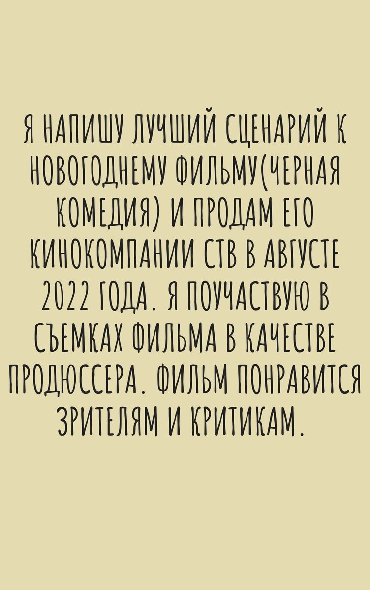 Цель, дата и план! У меня есть глобальная цель: Я хочу снимать и писать авторское кино, на деньги продюсеров. Цель поменьше: Выпустить абсурдный криминальный сериал ( наброски и наработки кое какие есть из тех самых недописок). Цель на которой я буду проверять теорию успеха: Продать собственный сценарий новогоднего фильма компании СТВ. И поучаствовать в качестве продюсера в его съемках. Договор о продаже будет подписан в августе 2022 года. Объясню, я люблю компанию СТВ за Брата, за их экспериментальные фильмы и мультики. Мне это очень нравится. Остальные компании идут по накатанной, а СТВ старается или старался чем-то разнообразить. Пока моя аффрикмация будет такой, ее я поставлю на главный экран телефона. ПЛАН по достижению цели. (его я поделю на мелкие ступеньки) 1. Бросить пить. Совсем бросить.( для меня это важно. Ну во-первых долго отходить после употребления, во-вторых теряю кучу времени и денег. Чтобы вы понимали, я пью пиво примерно раз в неделю 3-4 литра). И мозги без вы