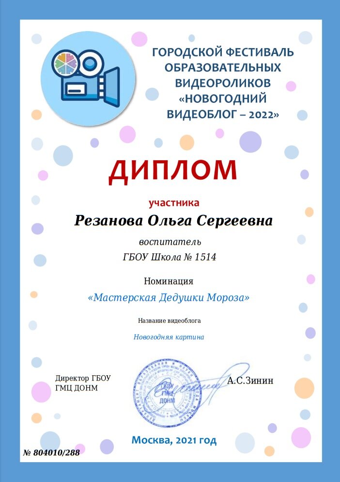 Завершился Городской фестиваль образовательных видеороликов «Новогодний видеоблог – 2022». Всего в Фестивале приняли участие 1394 педагогов дошкольного образования, 575 участников награждены дипломами Фестиваля. Воспитатели дошкольных групп «Семицветик» ГБОУ Школа № 1514. Резанова О.С. и Максименко А.Е. представили образовательные авторские видеоролики на новогоднюю тематику в номинации «Мастерская Дедушки Мороза». За представленные профессиональные практики и развитие культурных традиций дошкольного образования Резанова О.С. награждена дипломом за видеоблог «Новогодняя картина», Максименко А.Е. отмечена сертификатом за видеоблог «Новогодний мультфильм». Поздравляем Ольгу Сергеевну и Александру Евгеньевну, желаем успехов в реализации творческого потенциала! #школа1514 #Семицветик1514 #фестиваль #Новогоднийвидеоблог