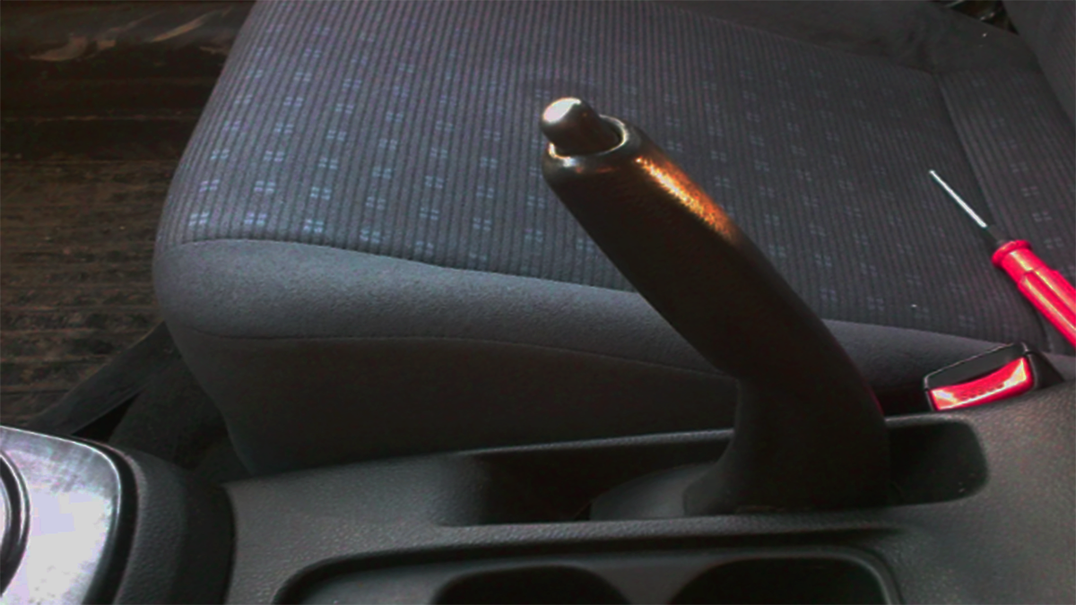 Для дальнейших действий потребуется парочка отвёрток и ключ на 12. Снимаем с ручника футляр, чтобы добраться до скрепляющей его болта. Находится он под кожухом. Далее поворачиваем ручник вниз, накидываем ключ на найденную деталь и затягиваем проблемный элемент (проворачиваться он будет к передней части машины).