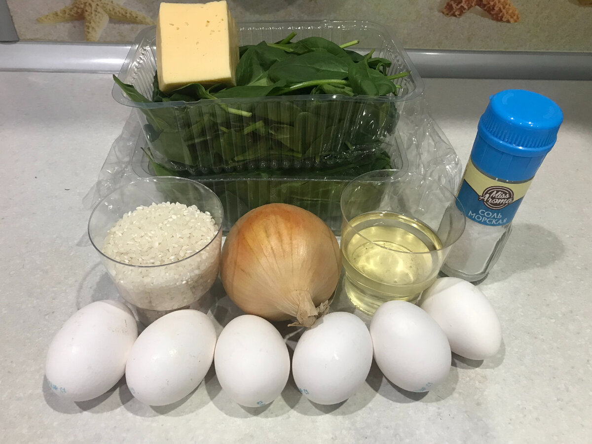 Очень вкусная и необычная запеканка. Рис придает ей сытость, шпинат делает ее полезной, а с помощью яиц она прекрасно держит форму и не разваливается. Начнем приготовление. Продукты, которые я подготовила: 1. Рис я предварительно отварила в чуть подсоленной воде примерно 15 минут. Затем откинула на дуршлаг и промыла под водой. Оставила, чтобы стекла вода. 2. Затем шпинат выложила в дуршлаг и хорошо промыла под струей воды. 3. Довела до кипения воду в кастрюле и выложила в нее шпинат. Дождалась повторного закипания и отбросила шпинат обратно в дуршлаг. 4. Когда он немного остыл отжала лишнюю жидкость и мелко порубила шпинат. 5. Репчатый лук почистила, помыла и нарезала маленькими кубиками. 6. Яйца разбила в глубокую тарелку, чуть-чуть посолила и взбила венчиком. 7. Твердый сыр натерла на крупной терке. 8. В разогретую с растительным маслом сковороду выложила лук и обжарила его до золотистости. 9. Далее к луку добавила шпинат и обжарила еще 3 минуты. 10. В глубокую миску выложи