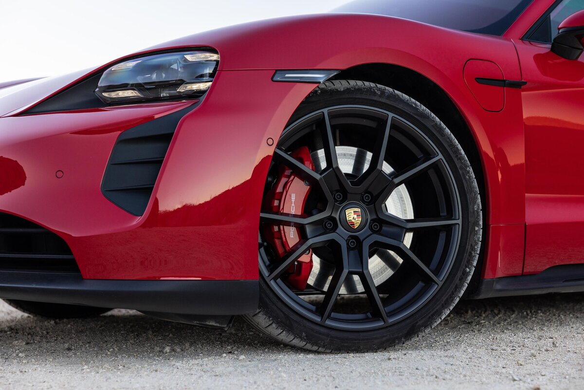 Как и другие Taycan, GTS стандартно поставляется с пневматической подвеской и адаптивными амортизаторами. Здесь, однако, они жестче, чтобы еще больше улучшить поперечную динамику. Мой тестовый автомобиль ездит на дополнительных шинах Michelin Pilot Sport 4S 275/35R21 спереди и 305/30R21 сзади (245/45R20 спереди и 285/40R20 сзади входят в стандартную комплектацию). Если что-то и сможет удержать весь этот вес, так это большой комплект липкой обуви.