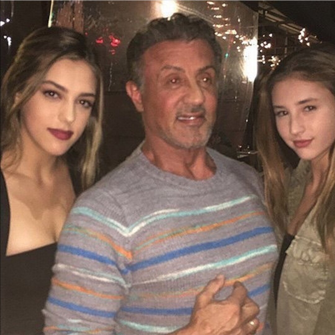 Семейный вечер Сильвестра Сталлоне с дочерьми Жил-был Сильвестр Сталлоне и было у него три дочери... Даже не мечтайте о месте рядом с голливудской звездой на красной дорожке: актеру до конца дней будет кого сопровождать на светских мероприятиях. Помимо красавицы-жены — американской модели Дженнифер Флавин, под руку со Сталлоне регулярно появляются 20-летняя София, 18-летняя Систин и 14-летняя Скарлет. Знаменитый отец гордится своими дочерьми и с большим удовольствием берет их на светские торжества или сопровождает в обычный будничный вечер, регулярно публикуя фото с прекрасной троицей на своей странице в Instagram. Сегодня актер в очереной раз поделился семейным фото и видео с Софией, Систин и Скарлет, которые сделал во время вечерней семейной прогулки, прокомментировав:Вечерний выход с девочками. Впрочем, Систин, София и Скарлет время от ремени появляются на красной дорожке и без знаменитого папы. Западные журналы уже называют юных красавиц новыми it-girls и прочат им большое будущ