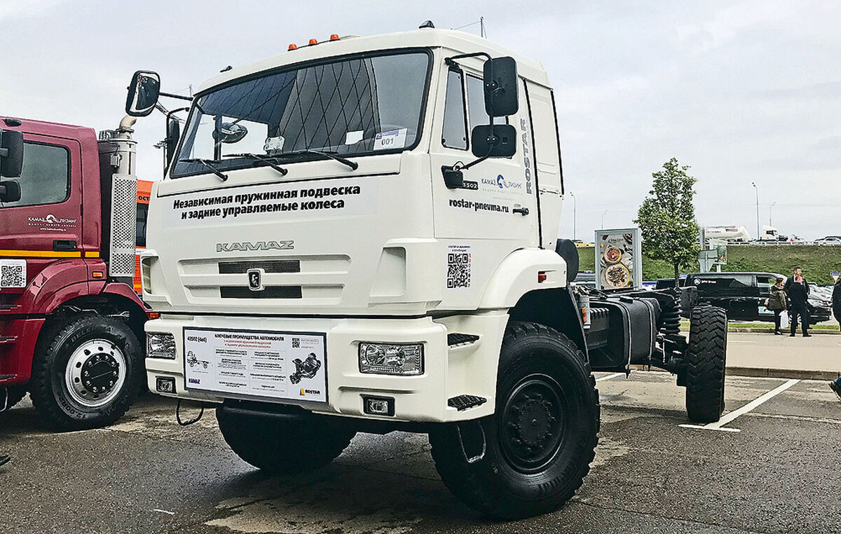 На международной выставке COMTRANS 2021 были представлены шасси КАМАЗ, переоборудованные компанией «Ростар-Инжиниринг» – дочерним предприятием группы компаний «РОСТАР» Подушки и штанги На выставке были продемонстрированы два вахтовых автомобиля с задней пневматической подвеской, установленной на шасси КАМАЗ-43502 4х4 и КАМАЗ-43118 6х6. Снаряженная масса шасси КАМАЗ-43502 составляет 7325 кг, допустимая масса надстройки с грузом – 5300 кг, а полная масса автомобиля с надстройкой – 12 700 кг. Снаряженная масса шасси КАМАЗ-43118 6х6 составляет от 8845 до 9395 кг, а допустимая масса надстройки с грузом – 12 680-12 130 кг, в зависимости от комплектации. Полная масса автомобиля с надстройкой 21 600 кг. Передняя подвеска обоих шасси – зависимая рессорная, с гидравлическими телескопическими амортизаторами. Задняя подвеска также зависимая, со стабилизатором поперечной устойчивости. Задняя пневмоподвеска «РОСТАР» имеет ряд преимуществ. За счет уменьшения динамического коэффициента увеличивается