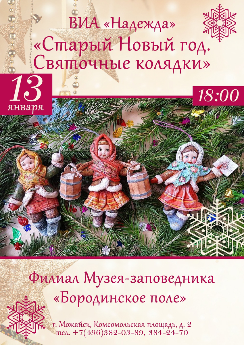 Праздничные колядки – старая-добрая русская традиция, некогда широко распространенная в народе, без которой не обходилось ни одно Рождество. Веселые зимние народные гуляния с песнями, плясками, частушками, гаданиями и гостинцами – это особое удовольствие для широкой русской души. Ждем всех желающих 13 января в филиале Бородинского музея по адресу: Можайск, Комсомольская площадь, д. 2. Начало в 18:00. Вход СВОБОДНЫЙ.