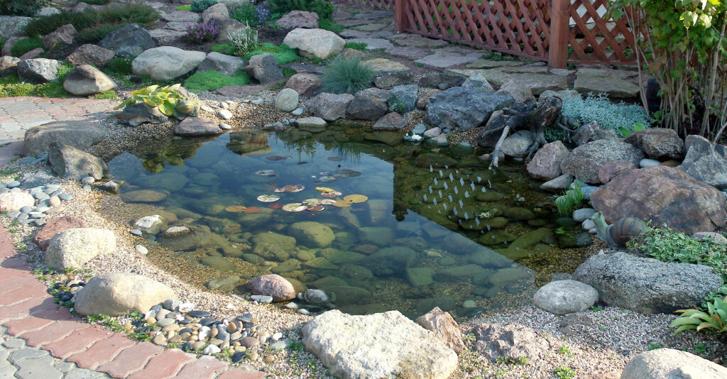 Местоположение пруда следует выбирать так, чтобы он не более 5 часов в день освещался солнцем и не располагался прямо под лиственными деревьями.