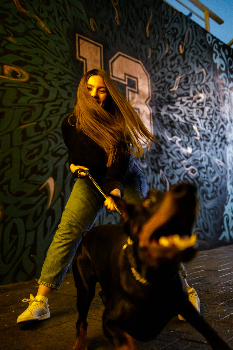 Я бы назвал каждую съемку с этим псом - ВЫЗОВ! А сессий с Ханом (так его зовут) у нас набралось уже не мало. И конечно же я перед даже самой первой давай гуглить, мол как фоткаются с доберманами?? И что я вижу? Цеееелая куча банальных обычных фоток а-ля вот я с собакой стою рядом.. Максимум появляются суперкрутые образы, прически и супер идеальные девушки.. Как же сделать что-то прикольное?? На помощь приходит как всегда теория "Нужен движ!" ) И она работает) Это была съемка контента для свеженькой кальянной в нашем городе под названием "13" 🙌 В сто раз сложнее снять что-то репортажное, чем постановочное, и когда получается, лично я кайфую.. Я очень хотел показать Хана крупняком, заставить его и моделей попрыгать побегать, поскалиться и поржать)) Увидел большую светящуюся цифру 13! Что сразу же приходит на ум? Отражение! Ищи где! Очки! Глаз! Дааа, давай снимать )) Есть висячие гирлянды! Как снимать гирлянды? Варианта два, либо просто так на фоне их - тухляк, либо рвать перспективу и