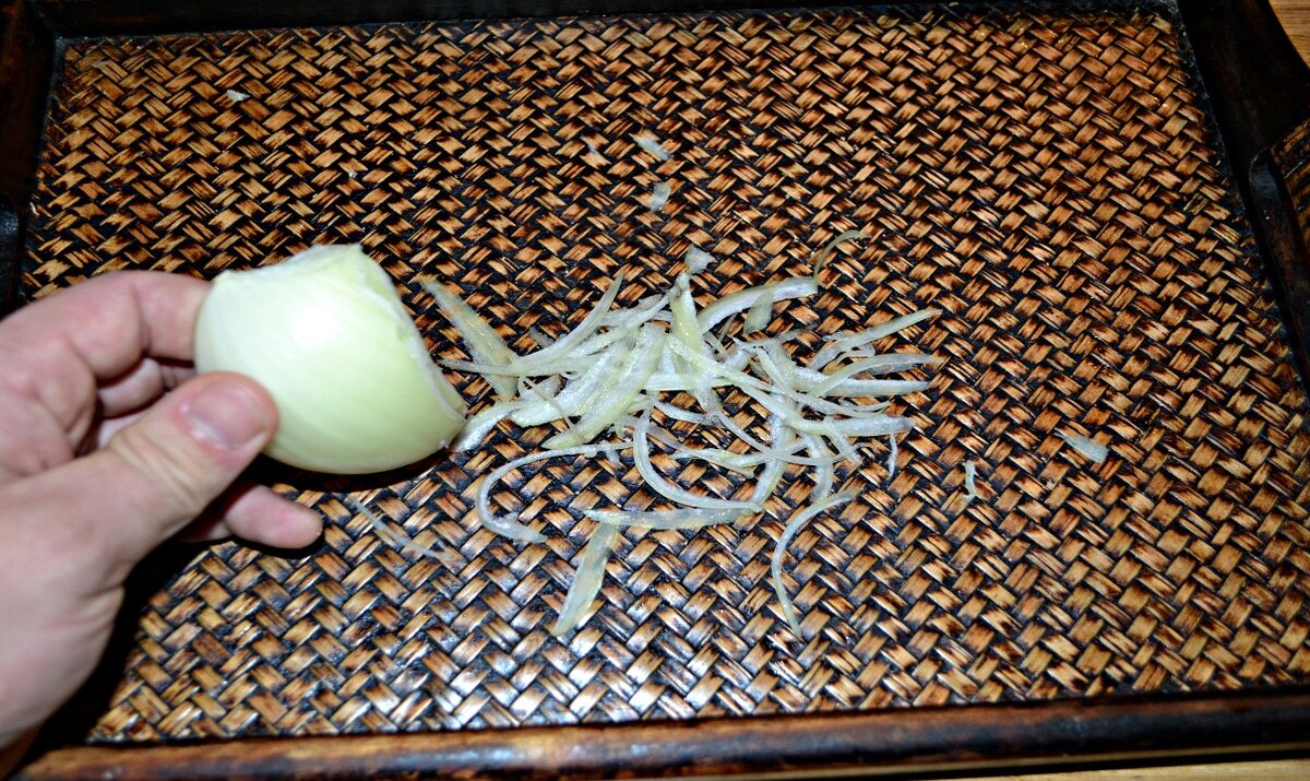 Увидел в грузинском кафе, как повара нарезают лук тончайшими полосками. (Не используя нож и какие-либо приспособления)