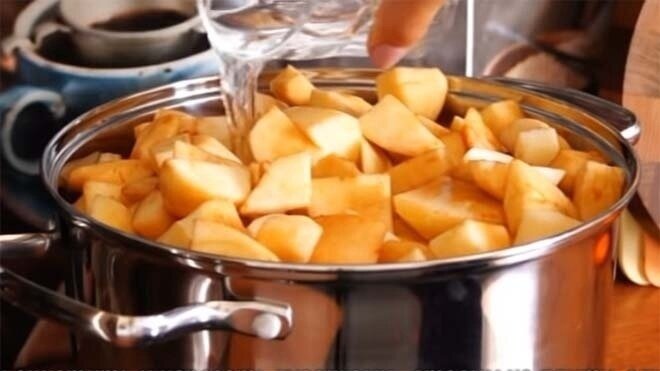Очищенные яблоки сложить в кастрюлю, влить воду и тушить на медленном огне до мягкости.