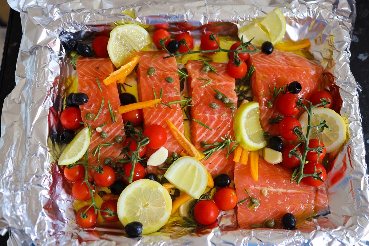 Друзья я приветствую вас на своём канале в сегодняшней статье хочу рассказать вам о приготовлении,быстрого,вкусного и лёгкого блюда из лосося запечёного в фольге Начинаем приготовление! Нам понадобится: Приготовление: 1. Если пласт лосося у вас не обработанный, чистим от чешуи при желании снимаем кожу, с помощью кулинарного пинцета вынимаем кости, хорошо промываем под проточной водой,обсушиваем и нарезаем стейками шириной 4-5 см, перекладываем нарезанный лосось в глубокую посуду, 1 лимон хорошо расскатываем по столу(так он хорошо даст сок) разрезаем на 2 части и взбрызгиваем рыбу, солим перчим по вкусу и перемешиваем,оставляем мариноватся на 15-20 минут 2.По всей ширине противеня застелаем кулинарную фольгу смазываем оливковым маслом и выкладываем лосось 3. Помидоры и болгарский перец хорошо промываем, с болгарского перца удаляем плодоножку и семена нарезаем небольшими брусочками выкладываем всё на противень с рыбой,с маслин слить жидкость и промыть под проточной добавляем туда же 4.