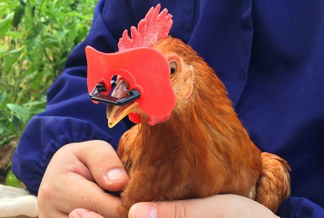Зная эти особенности зрения пернатых, специалисты разработали изделие, которое перекрывает упомянутую выше совмещенную видимую область. Кура после одевания ей очков лишается способности видеть объект, на который можно было бы напасть.