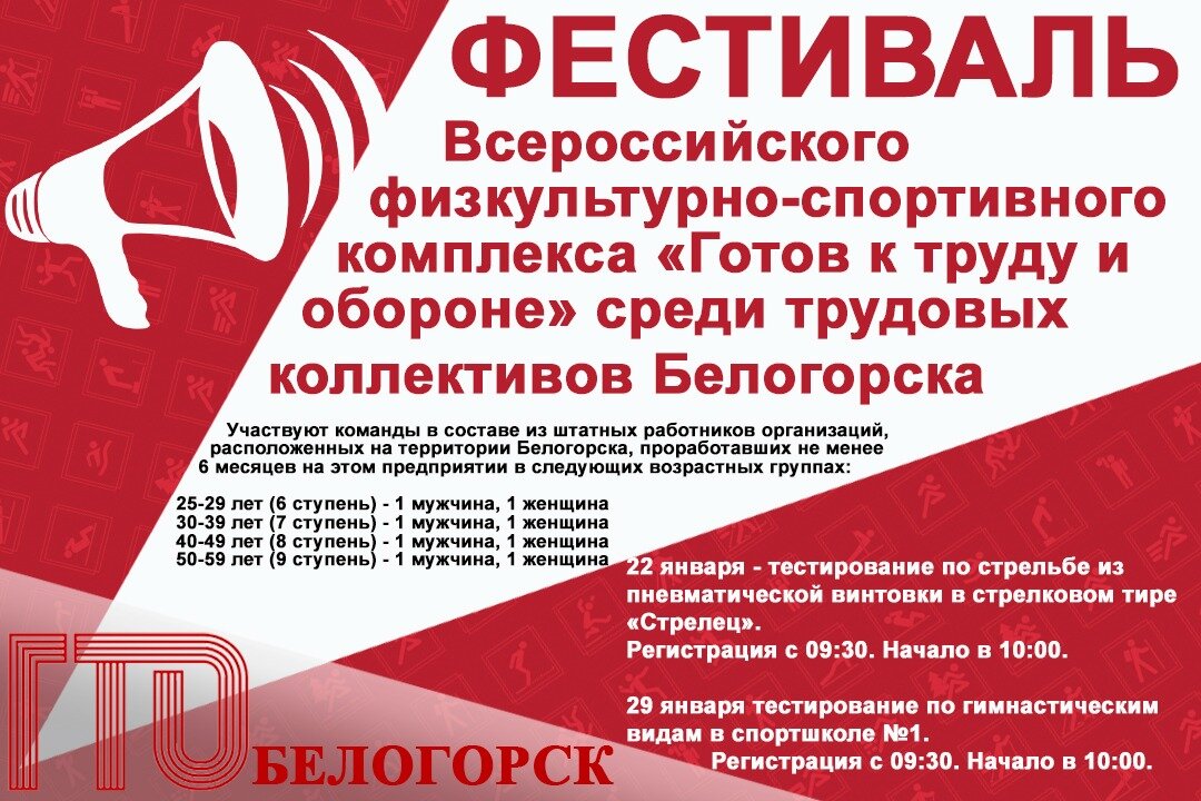 Фестиваль Всероссийского физкультурно-спортивного комплекса «Готов к труду и обороне» среди трудовых коллективов Белогорска откроет сезон тестирования 2022 года. Команда-победитель получит возможность участия в региональном фестивале, который состоится 12 февраля в Белогорье. К участию в фестивале приглашаются команды в составе из штатных работников организаций, расположенных на территории Белогорска, проработавших не менее 6 месяцев на этом предприятии в четырех возрастных группах (6-9 ступени ГТО) от 25 до 59 лет. Возраст участников определяется на 15 мая 2022 года. ― Фестиваль пройдет в два этапа, ― рассказывает руководитель Центра тестирования ГТО Белогорска Любовь Ткаченко. ― Первый состоится 22 января - тестирование ГТО по стрельбе из пневматической винтовки в стрелковом тире «Стрелец». Регистрация с 09:30. Начало в 10:00. Второй этап, 29 января, тестирование ГТО по гимнастическим видам в спортшколе №1. Регистрация с 09:30. Начало в 10:00. Испытания выполняются на максимально воз
